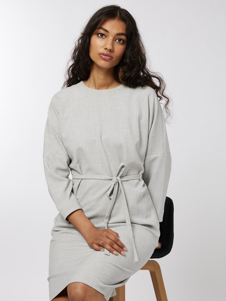 Renskåren kjole med 3/4 lang kimonoerm, rund hals og løst knytebelte i livet. Kjolen har gode lommer i siden, skjørt som smalner inn, og glidelås i ryggen. Lengde ca til under kneet. Grå variant er melert, og sort en ensfarget.