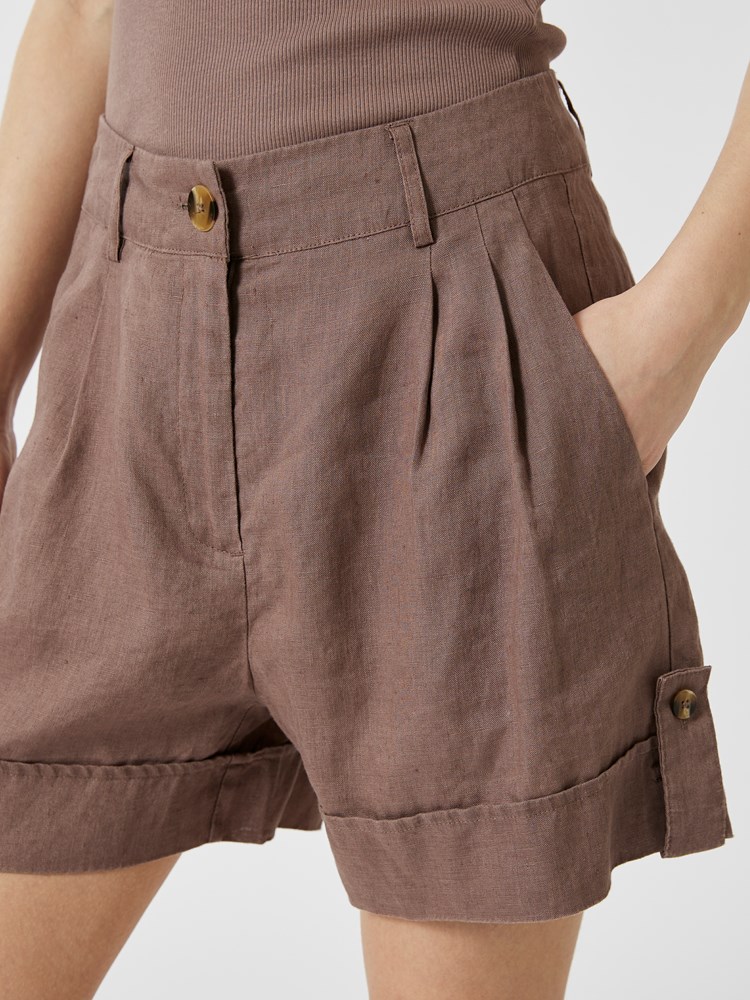 Komfortabel ledig linshorts med beltestropper og lukning med naturfarget knapp og glidelås i front. Shortsen har vide ben med oppbrett og hempe og passepoilerte baklommer. Modellen er 176cm og har på seg str 36.