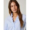 Smalstripet feminin bluse i bomullspoplin med v ringet rysjekrage og ton i ton knapper. Blusen har lang erm med liten puff og knappet mansjett, rett passform og en liten metallbadge med logo nede på siden. Modellen er 173 cm høy og bruker str S.