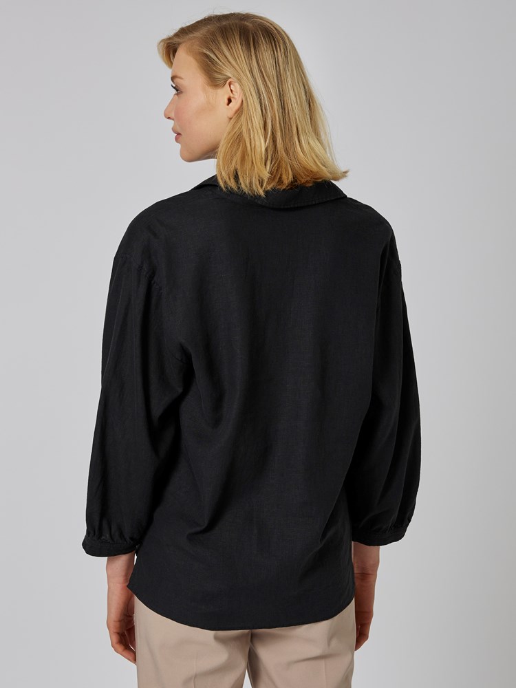 Komfortabel bluse i myk blanding av lin og viskose med krage og splitt med knapp i front. Blusen har ledig passform med vide 3/4 lange ermr med rynker og liten mansjett nederst. Modellen er 176cm høy og har på seg størrelse 36