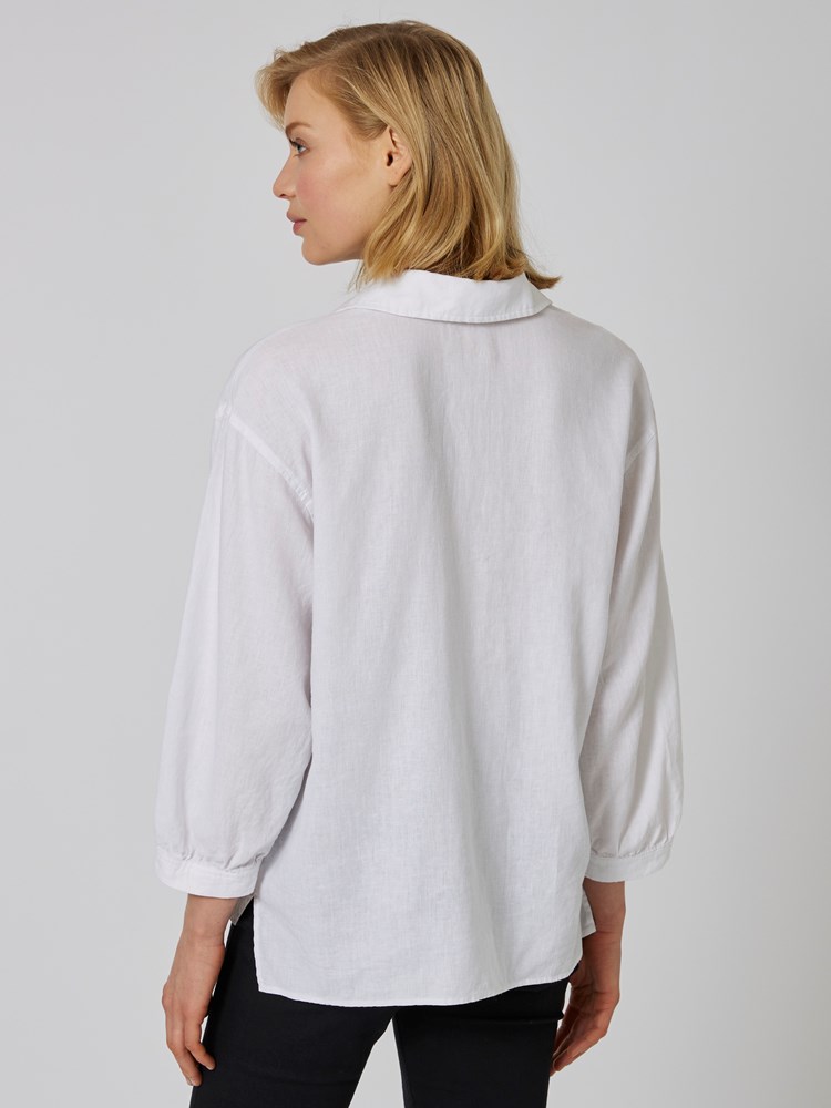 Komfortabel bluse i myk blanding av lin og viskose med krage og splitt med knapp i front. Blusen har ledig passform med vide 3/4 lange ermr med rynker og liten mansjett nederst. Modellen er 176cm høy og har på seg størrelse 36
