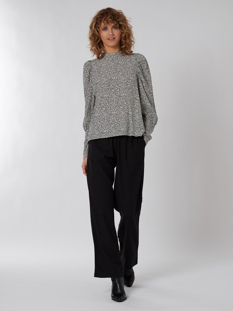 Feminin mønstret bluse i lett viskose kvalitet. Blusen har halvhøy krage med glidelås bak, draperte ballongermer med høy knappet mansjett og rett passform.