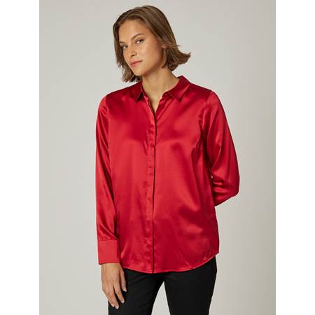 Klassisk bluse i sandvasket silke med høy andel stretch. Blusen har krage, en stoffknapp øverst og skjult knappestolpe, mansjett med knapping på erm, og ledig passform.