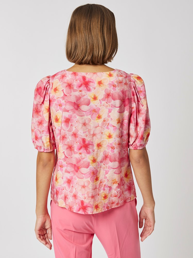 Feminin bluse i viskoseblanding med delikat mønster. Blusen har v utringing, stofftrukne dekorknapper i front samt pufferm med volum og elastikk nederst. Ledig passform.