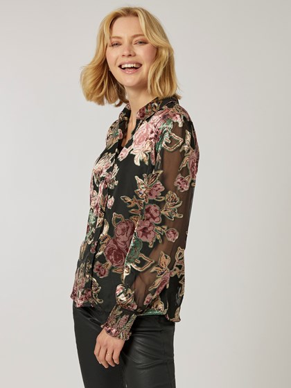 Skjorte med vevet velourstruktur i delikate farger. Skjorten har krage og knappestolpe med stoff-trukne knapper, lang pufferm med høy elastisk mansjett, innsnitt i ryggen og ledig passform. Blusen er uforet.