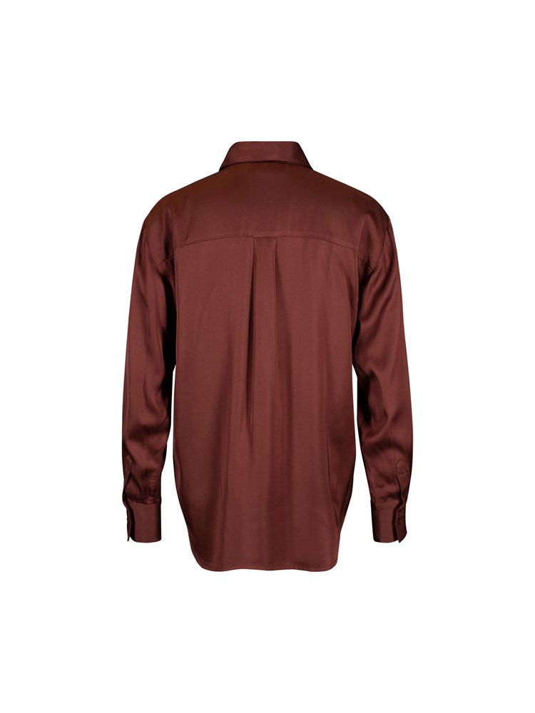 Skjorte i behagelig viskosesateng med lett oversized passform. Skjorten har krage, enkel knappestolpe med matchende knapper, lang erm med knappet mansjett, brystlommer og lett buet avslutning nederst. Modellen er 180cm og har på seg str 36.
