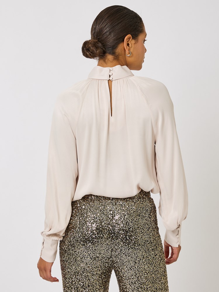 Bluse i delikat viskosesateng med rett passform og raglanerm med høy knappet mansjett og stofftrukne knapper. Blusen har krage med vridd detalj og åpning i front, samt splitt og knapp i nakken. Modellen er 175cm og har på seg str 36.