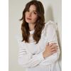 Delikat bluse i lett bomullskvalitet med feminine blondepartier og dekorbånd. Rund hals med liten rysjekant samt knapp og splitt bak. Blusen har pufferm med vidde, knappet mansjett, og volanger langs skulder foran og bak. Rett passform. Liten metallbadge med logo nede på siden. Modellen er 176 cm høy og bruker str S.