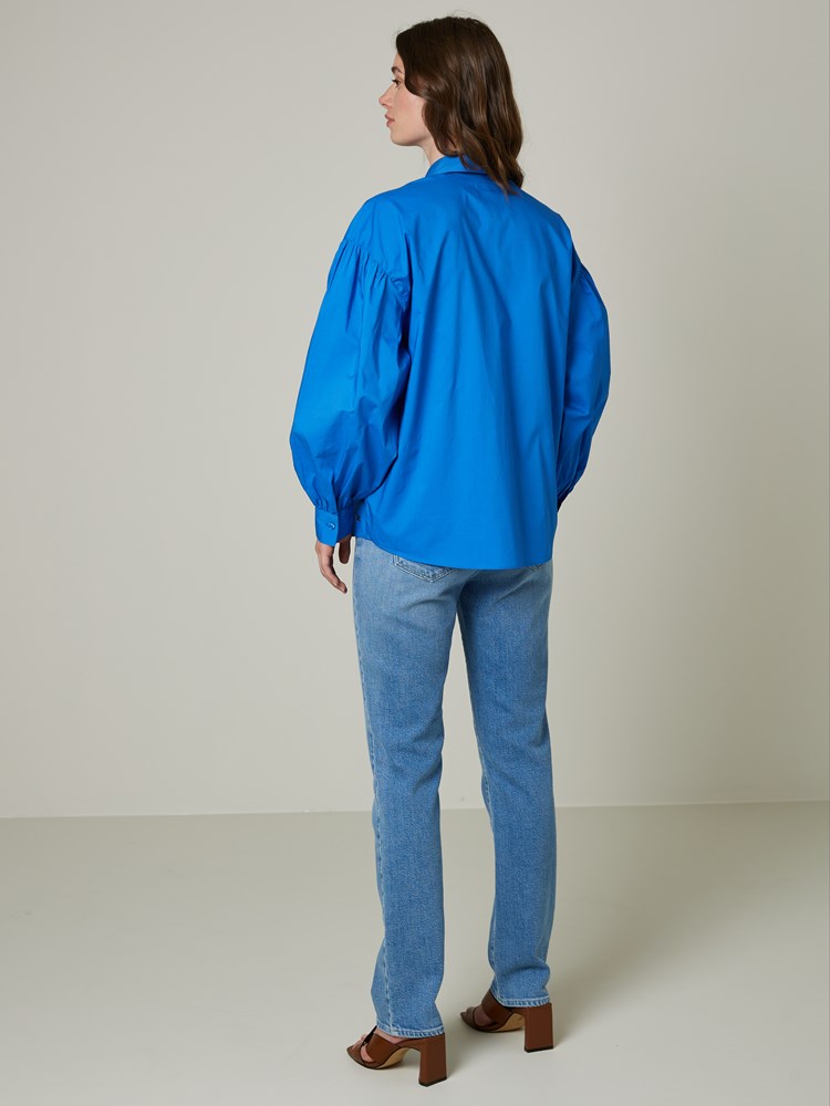 Skjorte i krisp poplin med lett oversized passform og senket skulder. Skjorten har knappestolpe med ton i ton knapper, og lang erm med vidde og knappet mansjett. Liten logobadge i metall nederst på siden. Modellen er 176 cm høy og bruker str S.