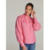 Delikat linbluse med klassisk krage og knappestolpe med trukne knapper. Blusen har rynket bærestykke foran og bak, ballongerm med puff og høy knappet mansjett. Ledig passform og en liten metallbagde nede på venstre side. Modellen er 176 cm høy og bruker str S.