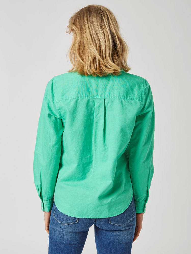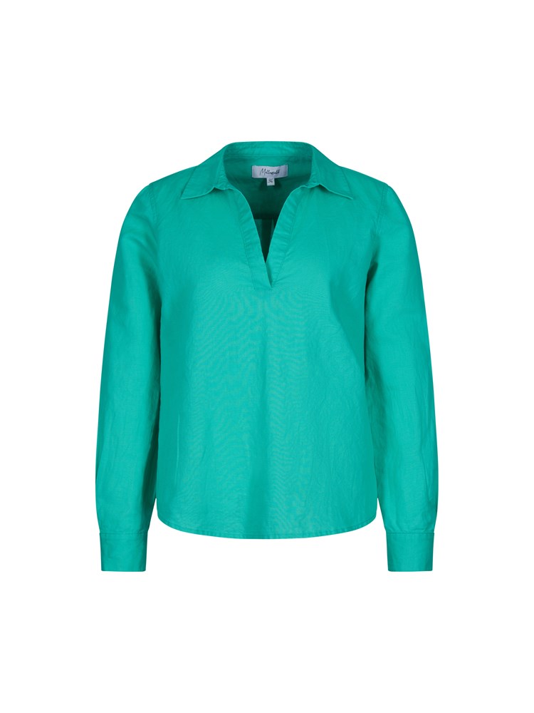 Tunika i behagelig blanding av lin og bomull. Tunikaen har krage og v utringing, lang erm med mansjett, bærestykke med fold i ryggen og buet avslutning nederst. Ledig passform. Tunikaen kommer i to ensfargede og en mønstret variant.