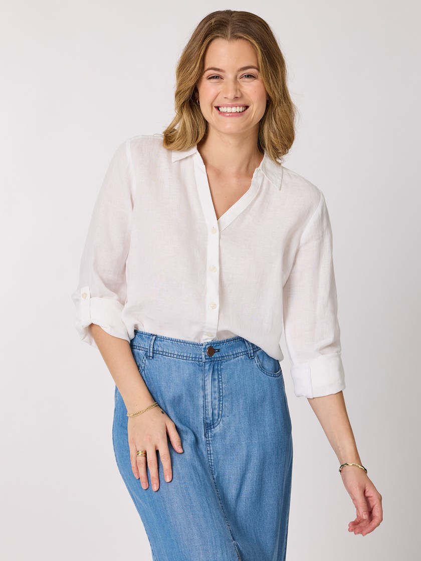 Linskjorte med krage, v utringing og knappestolpe med lyse knapper i front. Blusen har lang erm med knappet mansjett samt knapp og innvendig hempe for oppbrett. Ledig passform med bærestykke og fold bak. Skjorten kommer i ensfargede, stripet og blomstret variant