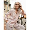Sval og behagelig bluse i 100% lin med delikat mønster. Blusen har v-utringing, frontknepping, 3/4 lang erm med splitt og to knapper og bærestykke bak med fold i ryggen. Ledig passform og liten sølvfarget metallogo nede til venstre