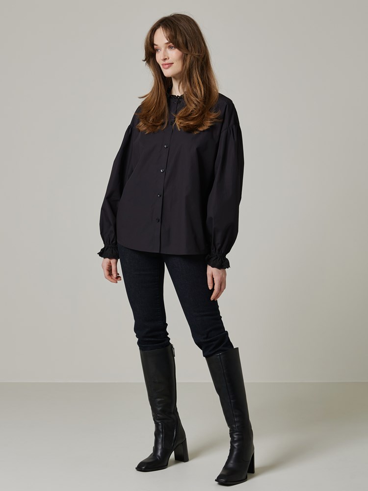 Ledig poplinbluse med feminine detaljer i engelsk blonde på krage og mansjett. Blusen har knappestolpe med matchende knapper i front og elastisk mansjett på ermet. Liten metallbadge nede på siden. Modellen er 173 cm høy og bruker str S.