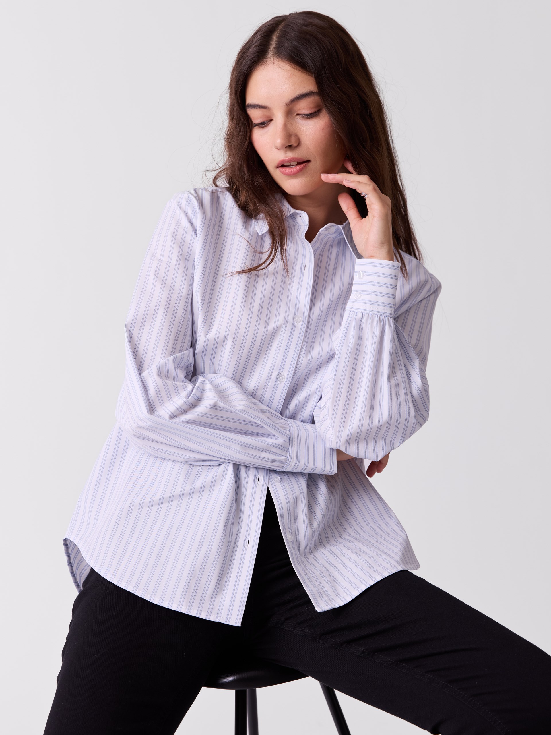 Avslappet poplinskjorte med bærestykke og fold i ryggen. To ensfargede varianter og en stripet