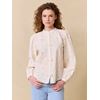 Feminin bluse i brodert engelsk blonde med liten rysjekrage og pufferm med volum og smal knappet mansjett. Blusen har bærestykke bak, stofftrukne knapper og ledig passform. Liten logobadge i metall nede på siden.