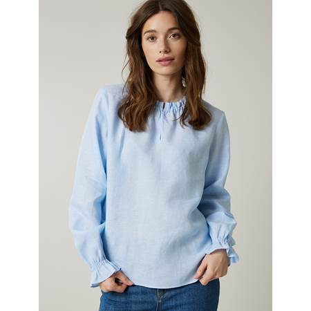 Bluse i krisp lin med feminine detaljer. Blusen har rund hals med elastisk rysjekant med splitt og knapp, lang erm med elastikk og rysjekant nederst, liten logobadge i metall nede i siden. Rett passform. Modellen er 176 cm høy og bruker str S.