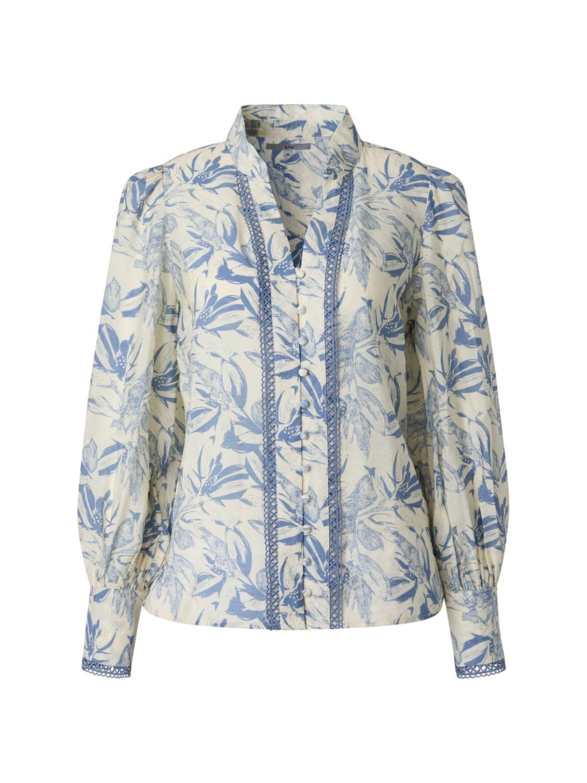 Bluse i lett og delikat viskoseblanding med mønster og blondebesetning. Blusen har en liten krage, strofftrukne knapper i front og lang erm med høy knappet mansjett. Ledig passform.