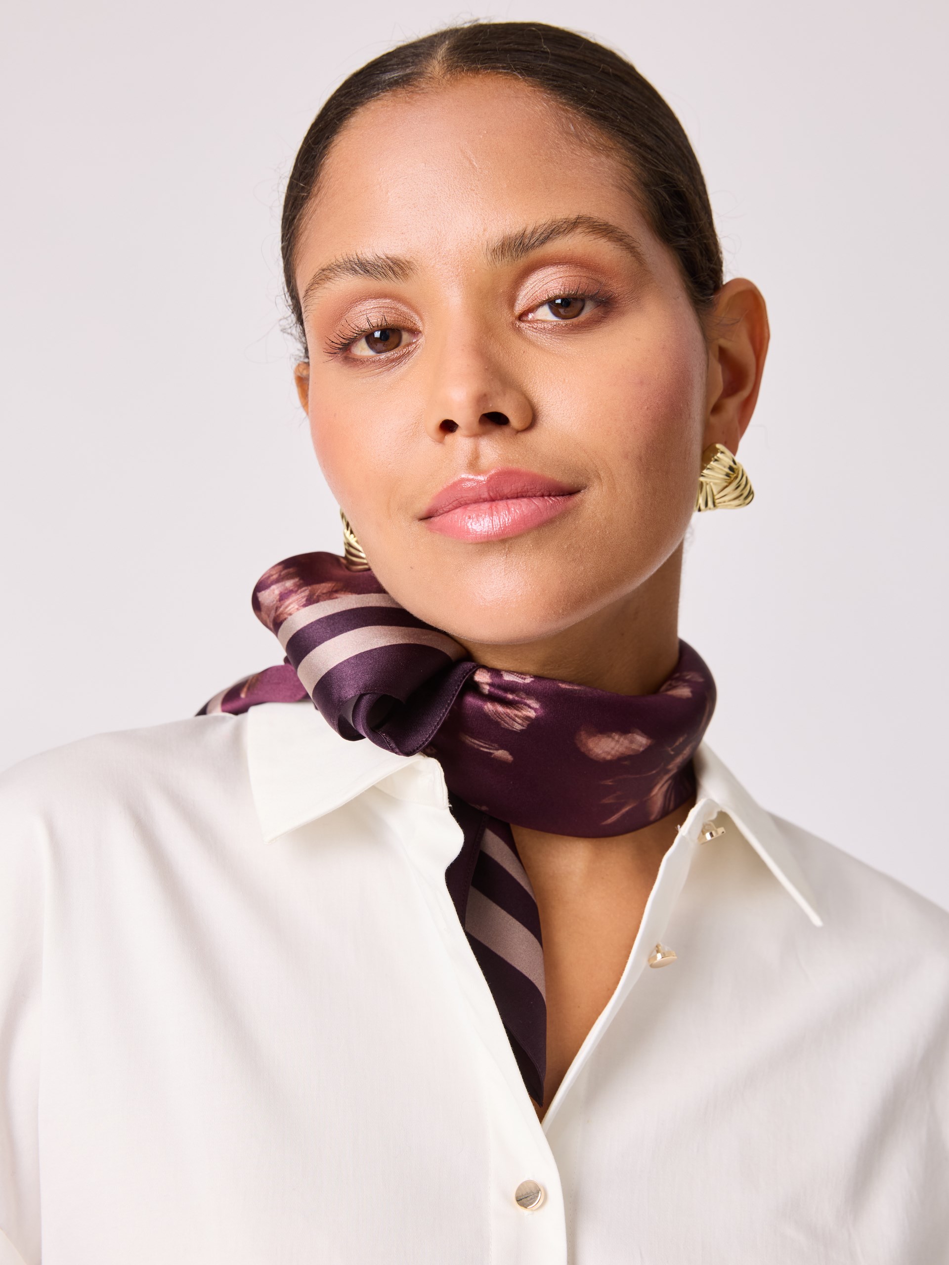 Mønstret skjerf i delikat silke. Skjerfet er 65 cm x 65 cm stort