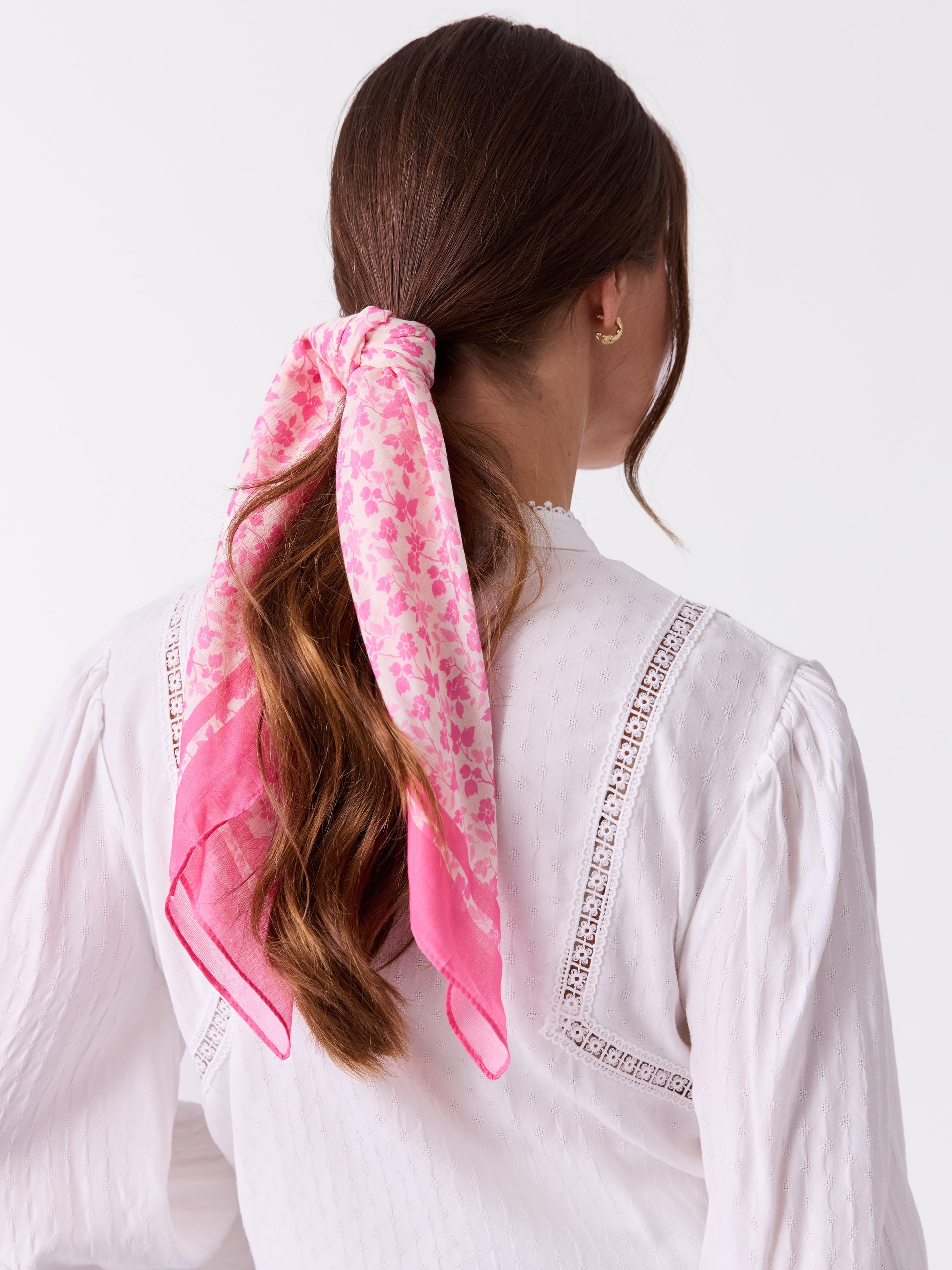 Delikat skjerf i bomull med silke. Skjerfet er 62 cm x 62 cm stort