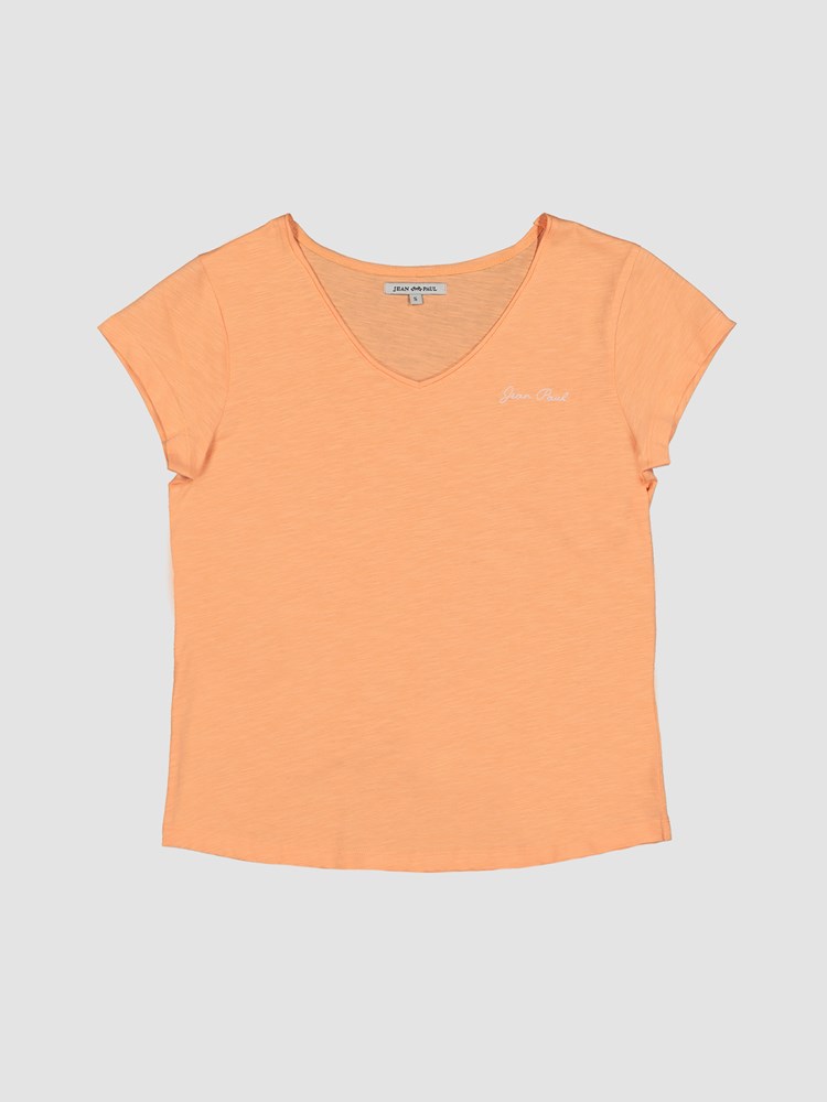 Feminin t-skjorte i slub yarn. Den klassiske t-skjorten har rund hals og buet avslutning nederst. Liten sølvfarget metallogo nede til venstre. Modellen er 173 cm høy og bruker str S.
