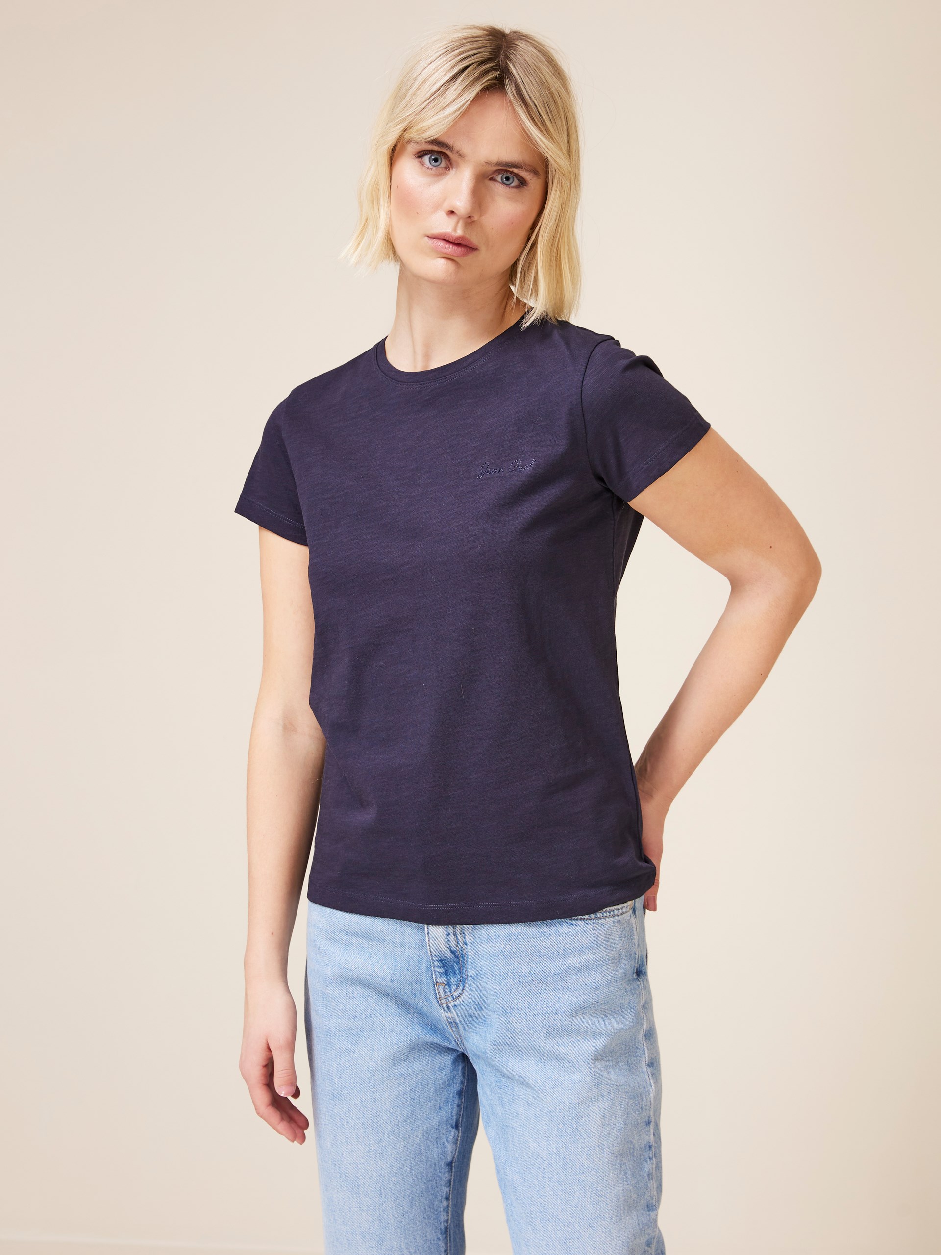 Feminin t-skjorte i behagelig slub yarn av bomull. T-skjorten har kort erm, rund hals og buet avslutning nederst. Liten sølvfarget metallogo nede på siden. Modellen har på seg str S.