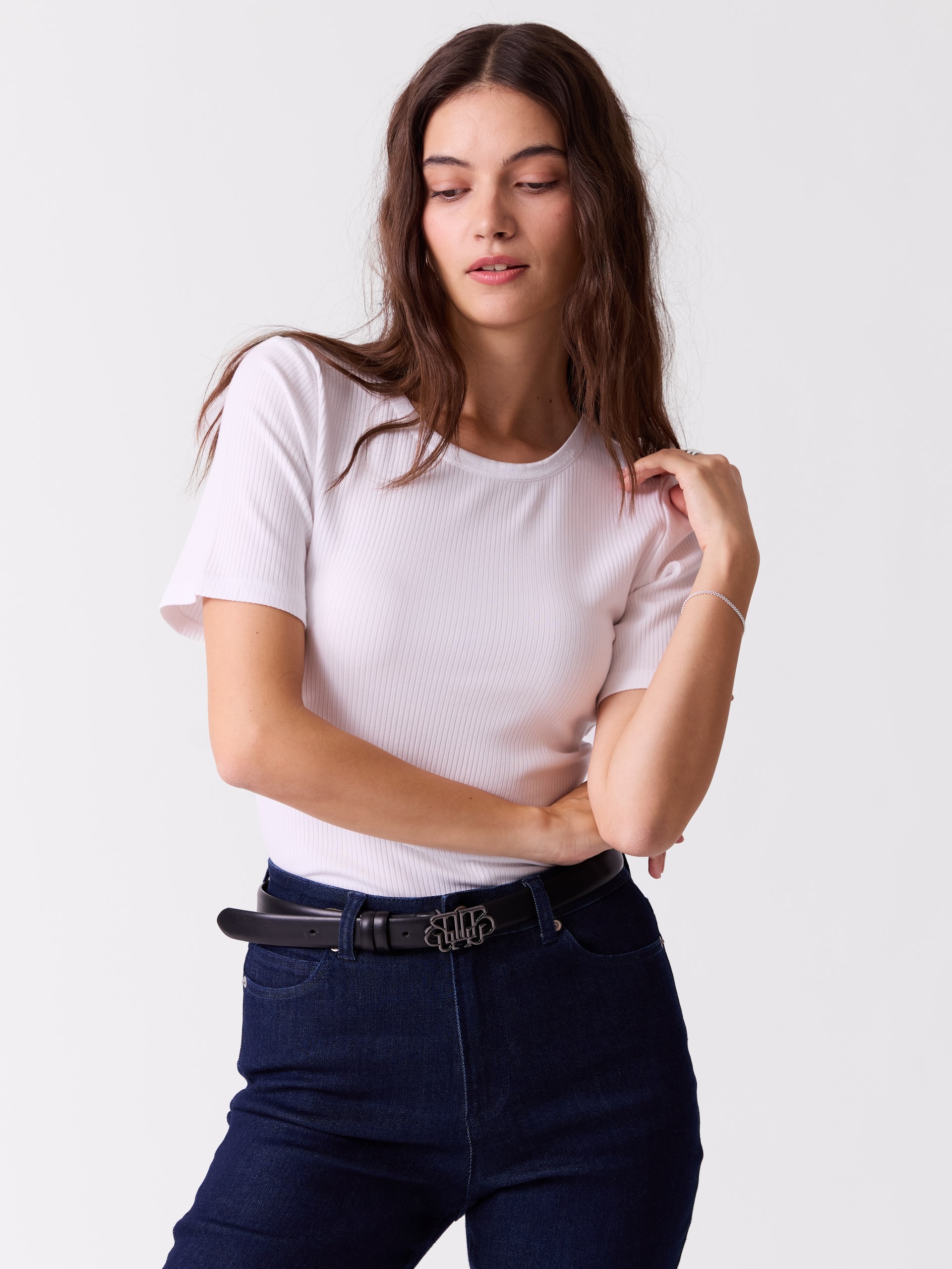 Feminin t skjorte med satengbånd langs halsåpningen