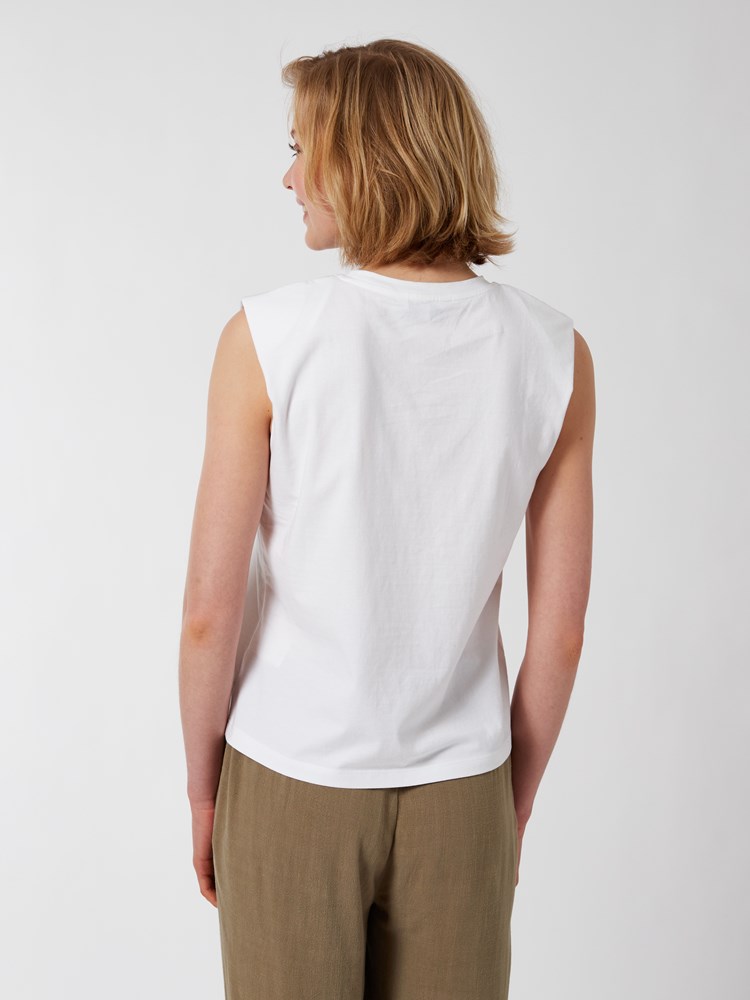 Ermløs singlet med liten skulderpute som gir ett definert skulderparti. Toppen har rund hals og ledig passform.