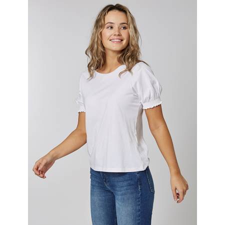 T-skjorte med rund hals og kort erm med elastikk og rysjekant nederst. Feminin passform. Modellen er 177cm høy og har på seg størrelse S.