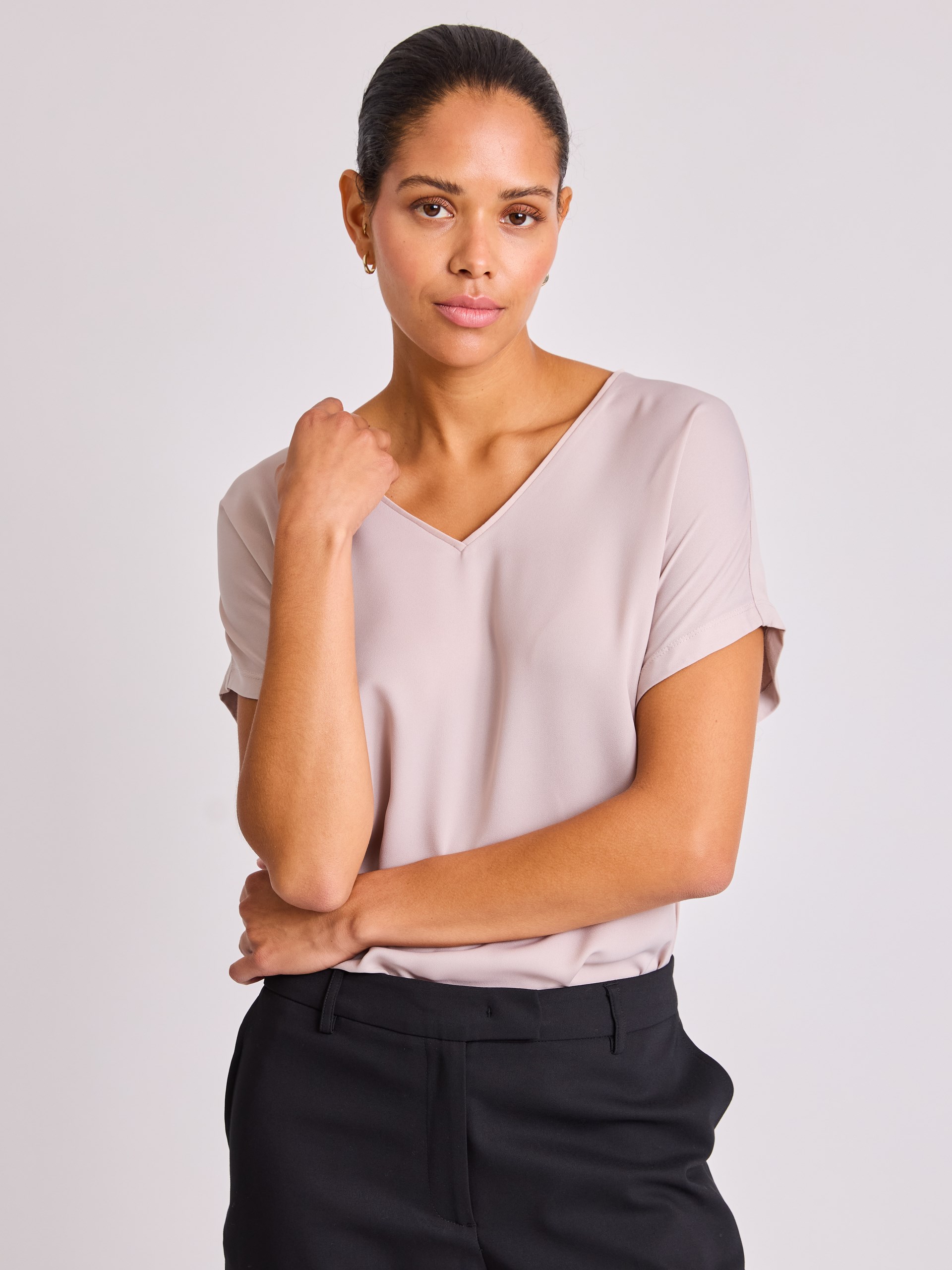 Ivy Tee er en v ringet base topp i behagelig kvalitet. Frontstykket av toppen er i satin polyester og bakstykket består av en myk jersey kvalitet. Ledig kvalitet