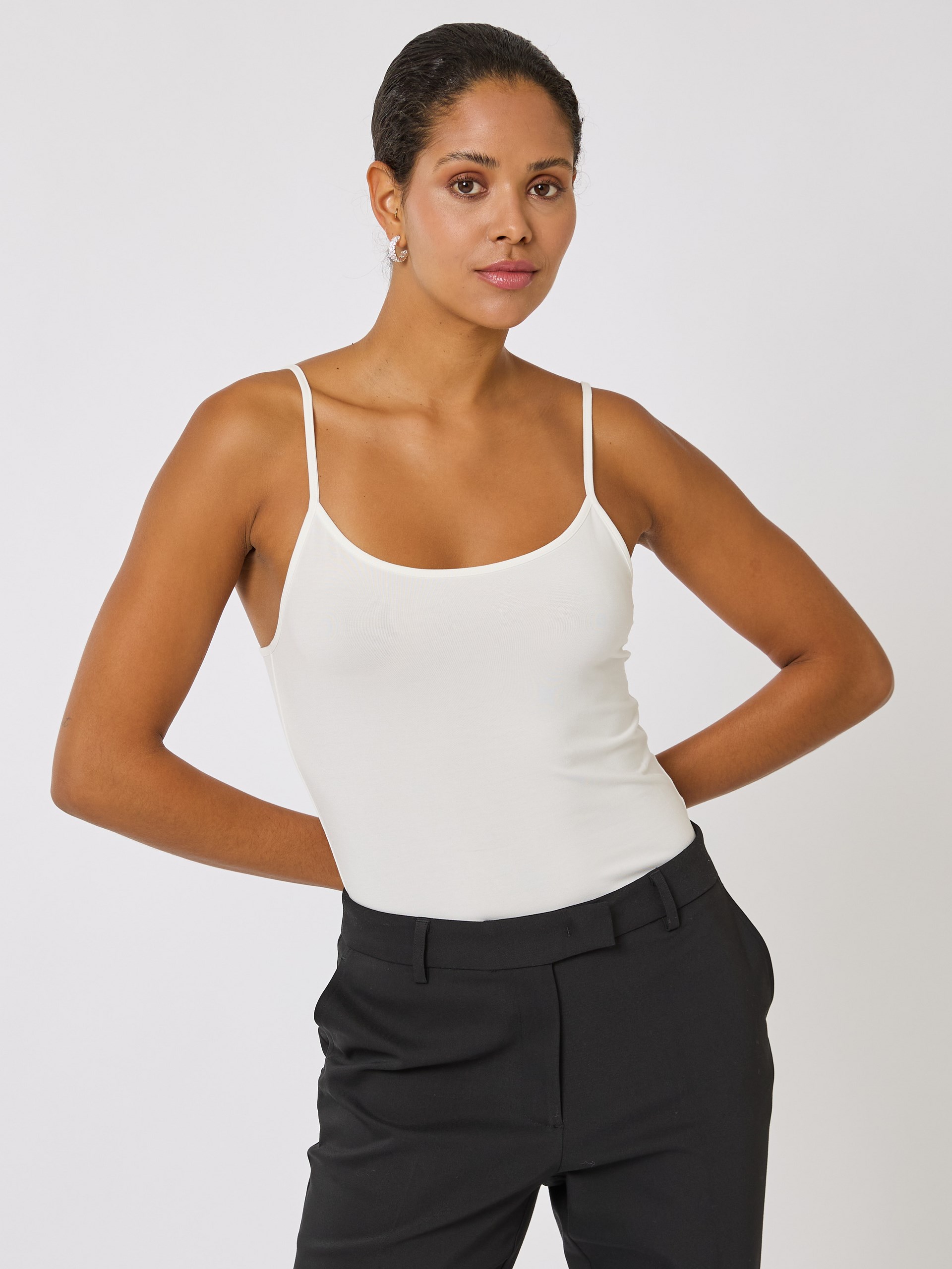 Komfortabel basesinglet med regulerbare spagettistropper og rundet utringing. Singleten er i en behagelig lyocell elastan blanding og har ettersittende passform.