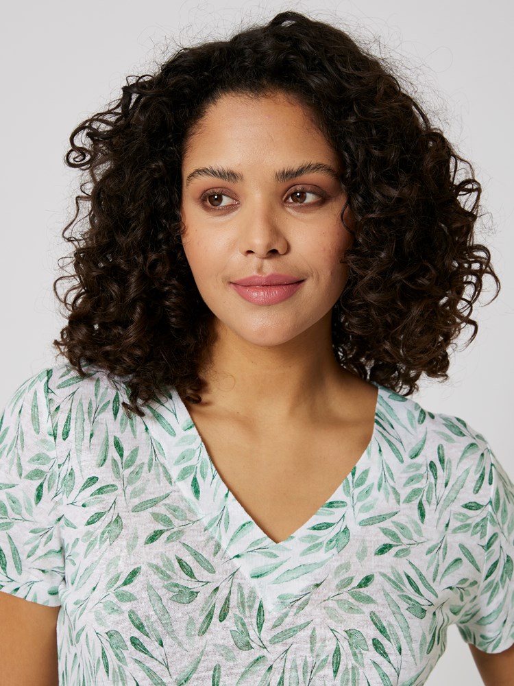 Mønstret t- skjorte med v hals og kort erm i behagelig 100% lin. Modellen er 175cm og har på seg str S.