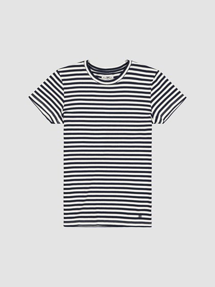 Stripet T-skjorte i myk ribkvalitet med rund hals og kort erm. T-skjorten har feminin passform og en liten sølvfarget logobadge nede på siden. Modellen er 176 cm høy og bruker str M.