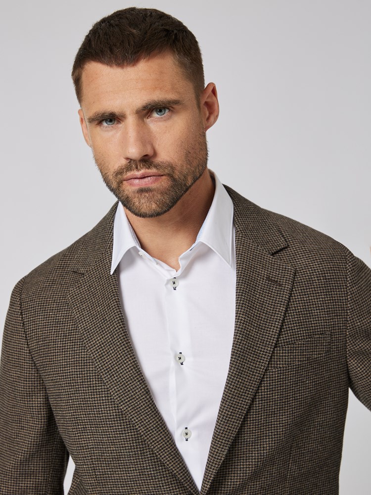 Elegant blazer i smårutet behagelig kvalitet med innslag av ull og komfortabel stretch. Blazeren har 2 matchende knapper i front, 4 knapper på ermet, samt to splitter bak, delikat halvfôr i en behagelig kvalitet av 50% polyester og 50% viskose. I tillegg har blazeren brystlomme, klaffelommer i front og to innerlommer. Tailored passform. Modellen er 184cm og har seg str B250.