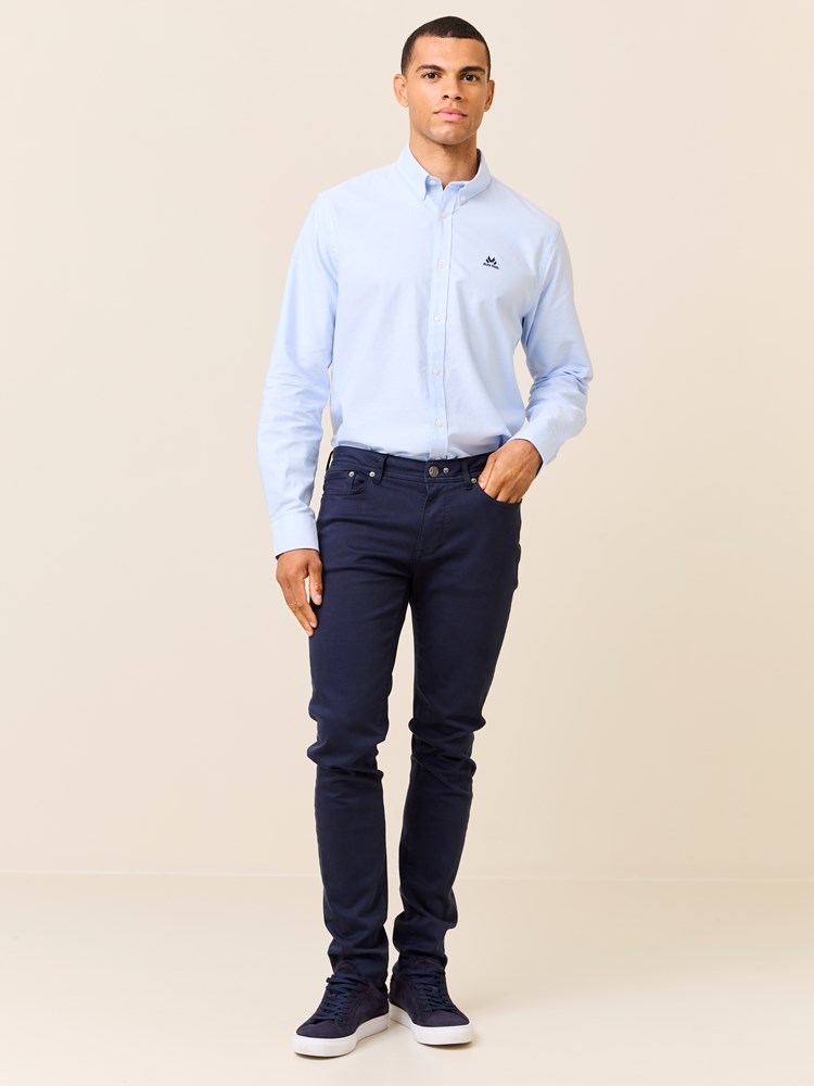 Tidløs og behagelig 5-lommers bukse i hyperstretch kvalitet med 80% elastisitet. Materialet er meget mykt og komfortabelt med en teknisk egenskap som gir full fleksibilitet i tillegg til at den alltid bevarer passformen. Varianten har kontrastdetaljer og metallbadge med logo over høyre baklomme. Dette produktet er plagg-innfarget på en spesiell måte og vil få et individuelt og levende uttrykk etter vask og bruk. Modellen er 190 cm høy og bruker str 32/34.