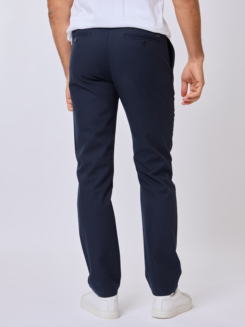 Chinos i bomull og elastan med lett struktur og lukning med knapp og glidelås. Buksen har stikklommer, passepoilerte baklommer med knapp, linning med beltestropper og rette ben som smalner lett inn nederst. God passform.