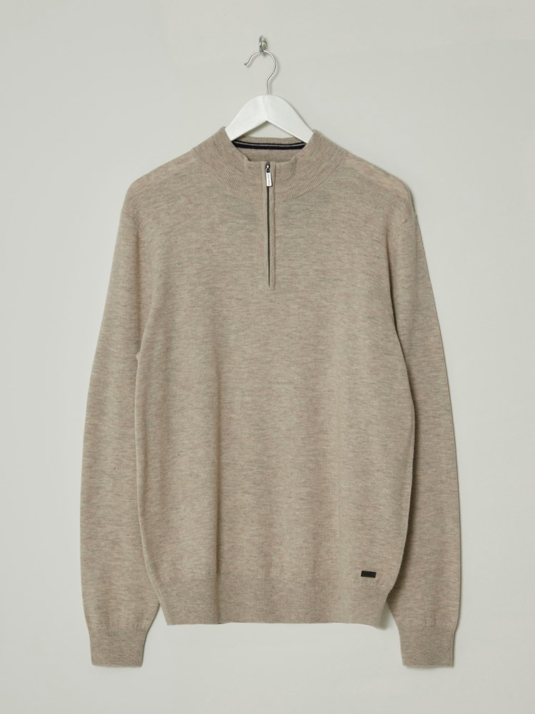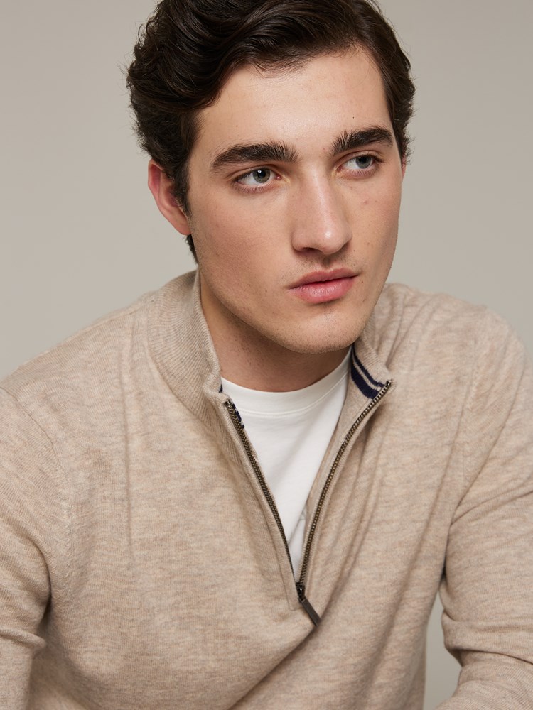 Genser med glidelåskrage i finstrikket merinoull. Genseren har en liten badge nede på siden, innvendig kontraststripe i kragen og klassisk passform. Modellen er 189 cm høy og bruker str M.