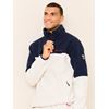 Lun og myk pilegenser med kontrastbesetning på bærestykke. Genseren har halvhøy krage med glidelås, innvendig kontrastfarget mesh i nakken, kontrastfarget broderi på skulder, vertikale frontlommer med kontrastfargede detaljer på glidelås og rett passform. Modellen er 185 cm høy og har på seg str L.