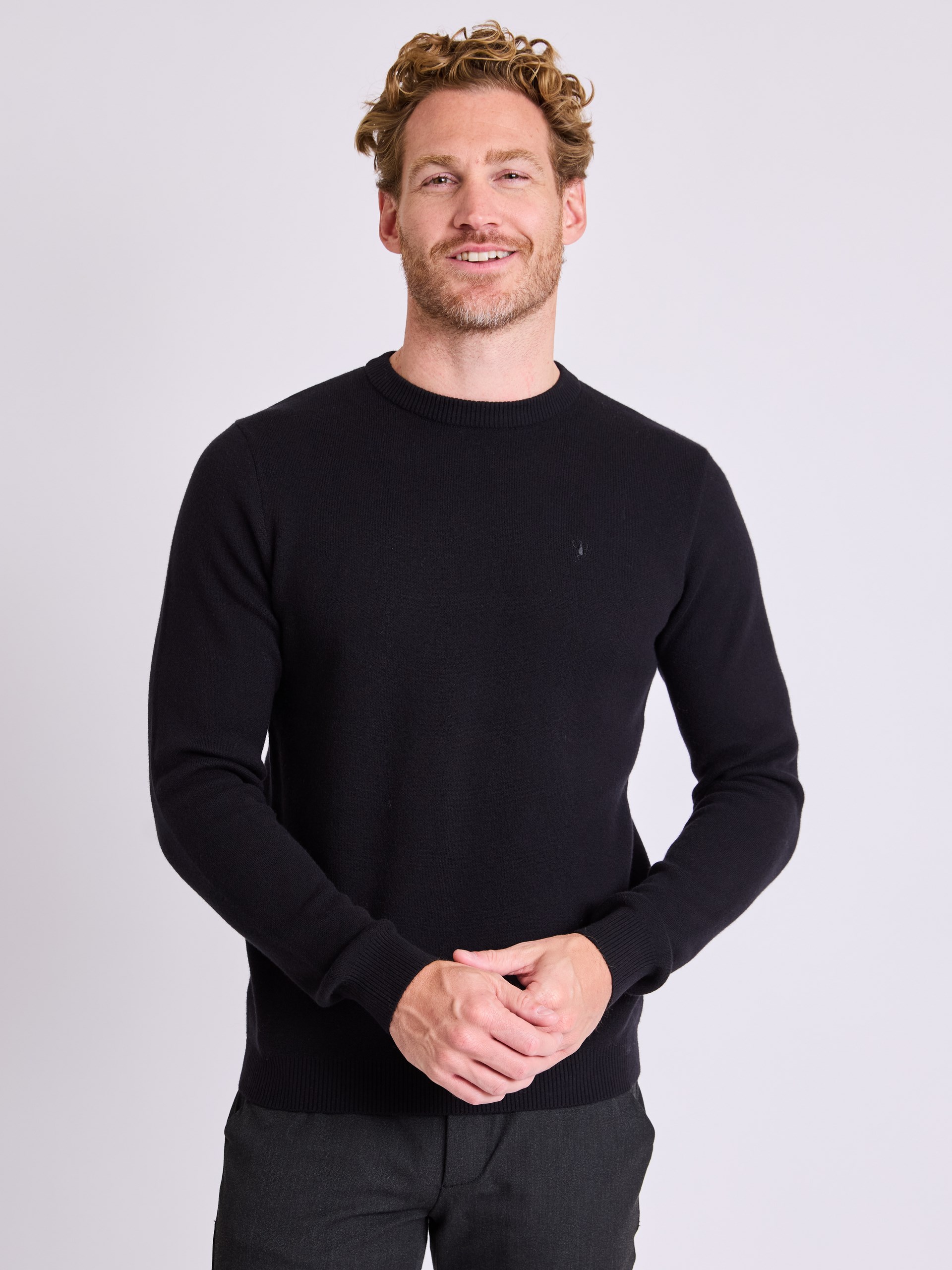 Stilren strikkegenser i behagelig bomull med innslag av nylon og litt ull.