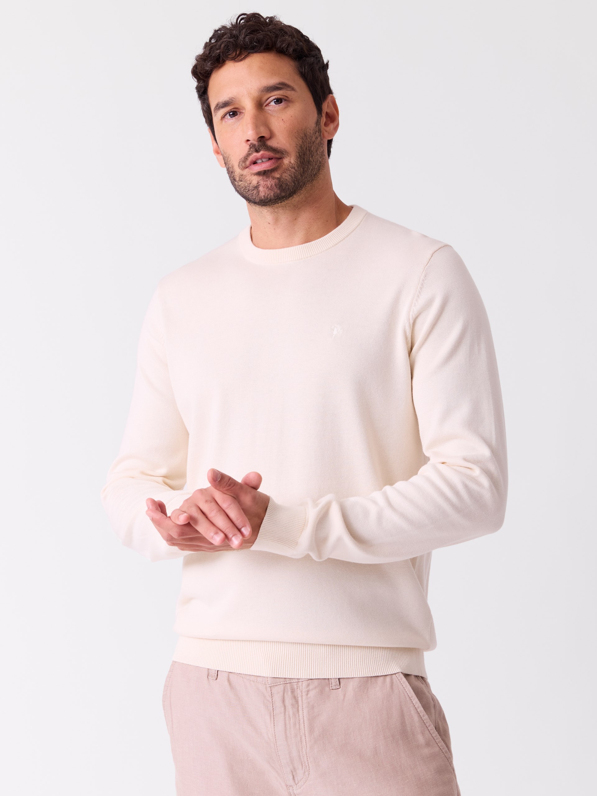 Lett og behagelig genser med melerte garner og vevet stoffdetalj inne i nakken.