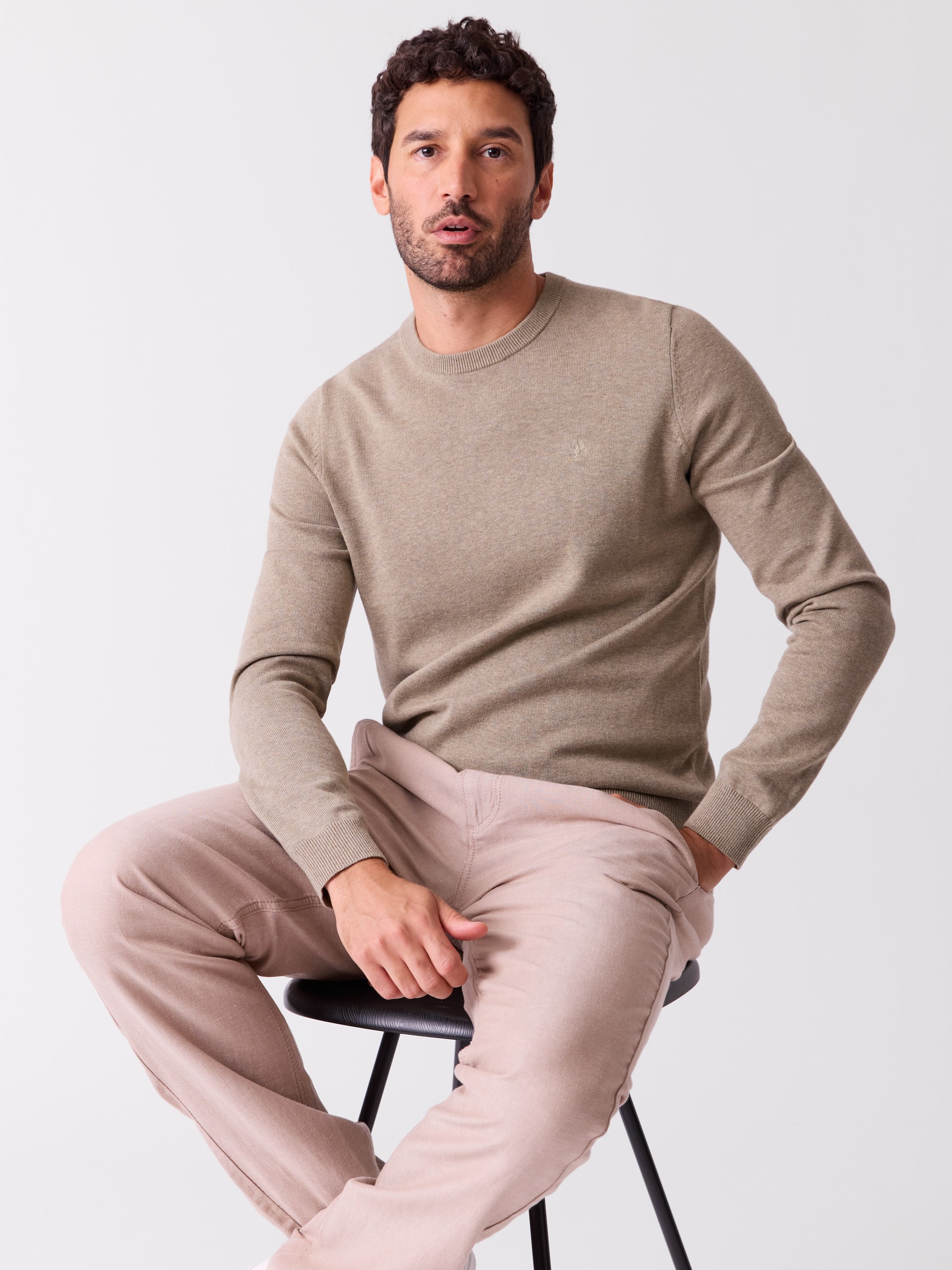 Lett og behagelig genser med melerte garner og vevet stoffdetalj inne i nakken.