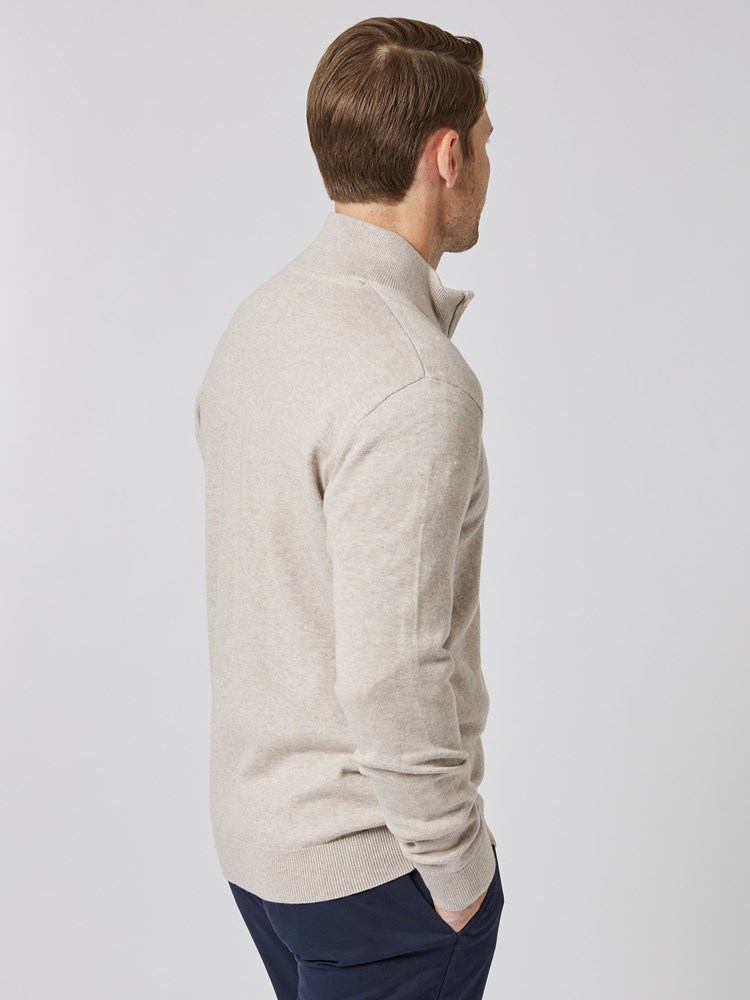 Finstrikket myk cardigan i bomull med innslag av kasjmir. Genseren har krage med innvendig kontraststripe, ribbestrikkede vrangborder, glidelås i front, og klassisk passform. Modellene er 184cm og har på seg str M