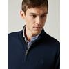 Finstrikket genser med glidelås i halsen. Den anvendelige genseren har halvhøy ribbestrikket krage, delikate detaljer inni nakken og ribbestrikkede vrangborder. Brodert logo på brystet. Modellen er 190 cm høy og bruker str M.