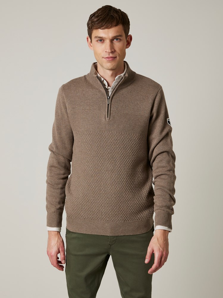 Genser med ton i ton mønsterstrikk og halvhøy glidelåskrage samt ribbestrikkede vrangborder. Genseren har metallglidelås med logopuller, tab i siden og en liten logobagde på ermet. Klassisk passform. Modellen er 189 cm høy og bruker str M.
