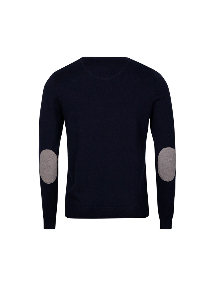 Finstrikket genser i myk ullblanding med v -hals og innvendig kontraststrikk i nakken. Genseren har strikkede albuelapper i kontrastfarge, ett lite logobroderi i kontrastfarge på brystet og ribbestrikkede vrangborder. Klassisk passform.