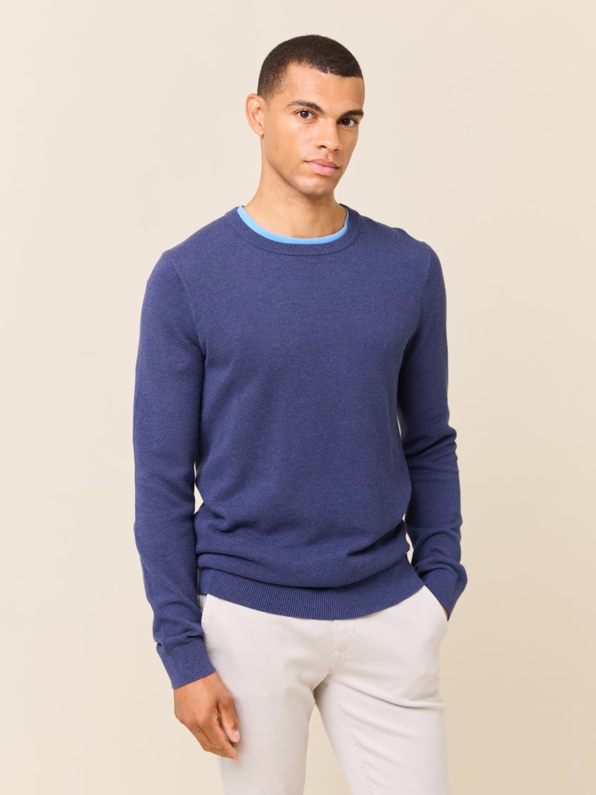 Lett genser i finstrukturert strikk av økologisk bomull med rund hals og innvendig kontrasttape i nakken . Genseren har en liten metallbadge med logo nede på siden og ribbestrikkede vrangborder. Klassisk passform. Modellen 185 cm høy og har på seg str L.