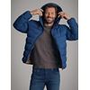 Lun og varm vattert jakke med brede tuneller og god hette med snøring. Jakken har elastisk tape på ermet og i kanten nederst, navyfarget glidelåstape, bronsefargede metallglidelåser og to skrå glidelåslommer. Liten gummibadge på ermet og normal passform.