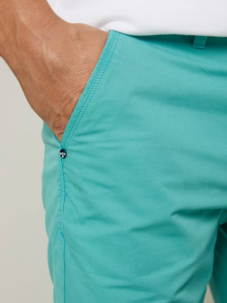 Chino shorts i myk 100% bomull med en komfortabel passform. Shortsen er plagg-innfarget i en spesiell vaskeprosess med et unikt uttrykk. Shortsen har kontrast detaljer, logo-print i livet bak og tricolore farget tab ved venstre lomme i front. Gylf med glidelås og knapp øverst, passepoilerte baklommer og blå logobadge over venstre baklomme. Passform: Normal livhøyde og setevidde. Materiale: Myk og fin twill kvalitet. Modellen er 189 cm høy og bruker str L.