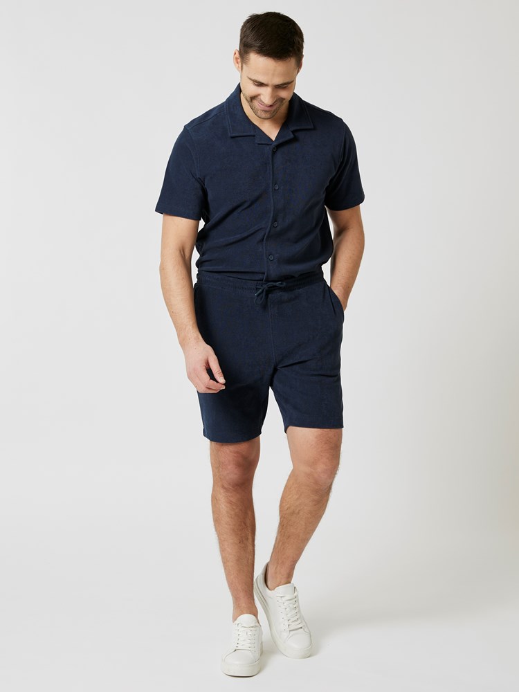 Behagelig shorts i bomulls frotté med elastikk og snøring i livet. Shortsen har stikklommer i siden og fukselommer bak. Ledig passform og god lengde. Modellen er 184cm og har på seg str M.