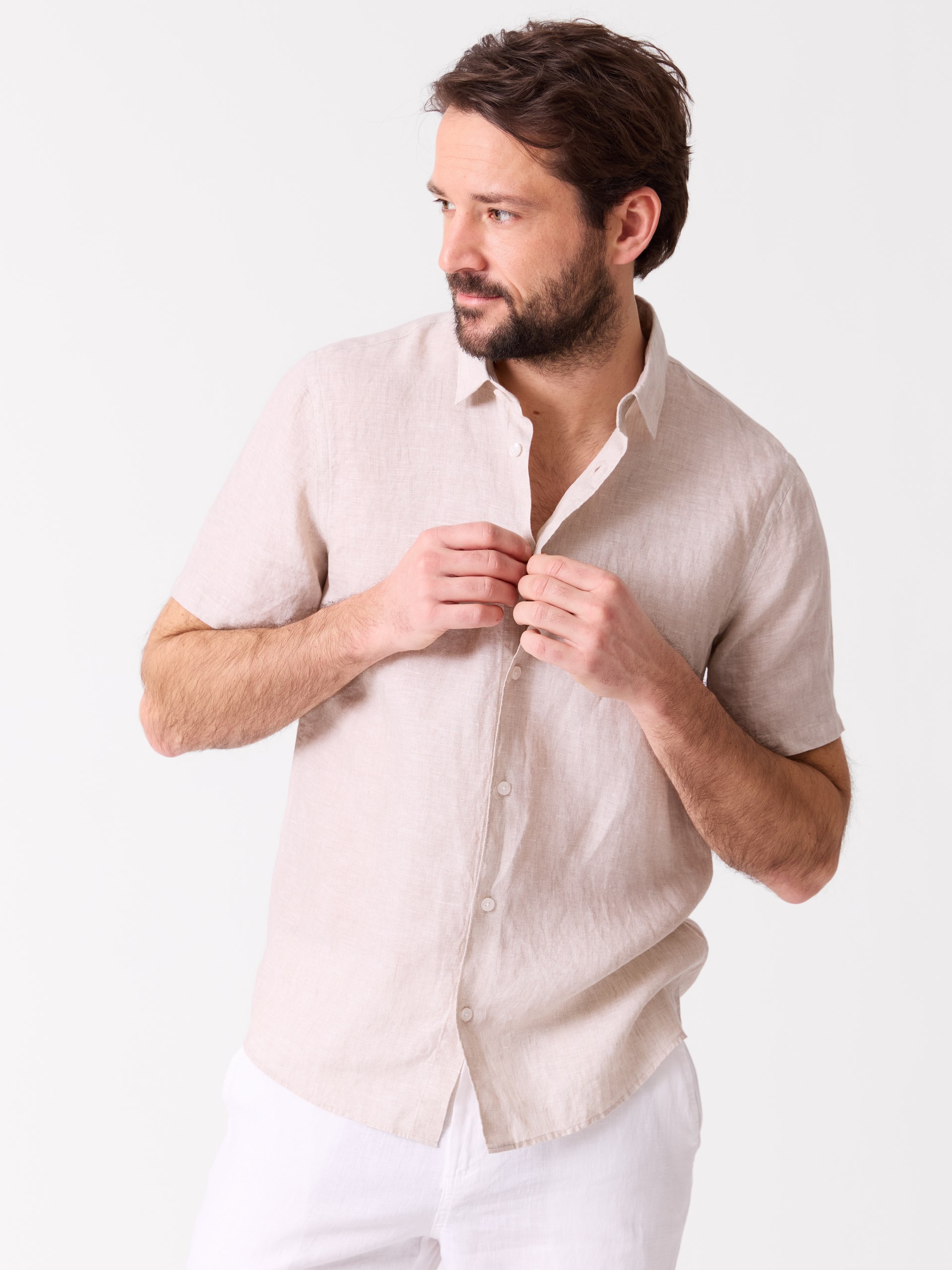 Skjorte i behagelig lin. Skjorten kommer i flere varianter, ensfarget, stripet og mønstret